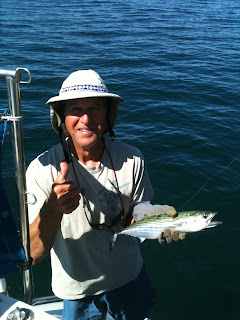 So off we went! Some of the highlights of the passage included star gazing, watching the moon set, waiting for the sunrise, and being escorted for a bit by a pod of dolphins visible through their bio-lumenesence. We could see the lights from several cities: Guaymas, LaPaz, and Obregon. Eventually we picked out lights from Loreto on the Baja side. Alan has been fishing; still hoping to do some catching. Doing an all night passage is tiring, even with three of us trading watches. So the first need was rest and we lazily napped all afternoon. Magic was tucked into a beautiful anchorage called Puerto Ballandra, along with three other cruising boats and a shack for fishermen, on the shore. We all slept well Wed. night and Thursday we launched the kayaks, explored the cove, then did a 5 mile hike across the island to see the abandoned salt ponds. In this very arid landscape, we were very surprised to discover many varieties of birds, none of which we recognized. Back home on Magic, we had a great meal and watched the movie "Date Night", which wasn't at all like the date nights we've had in Guaymas.